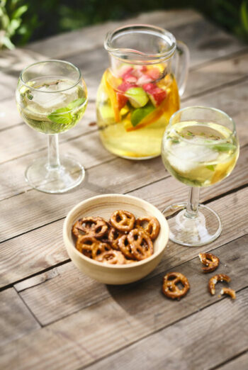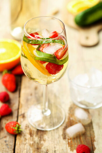 3/ To serve, divide the cocktail mix between 4 wine glasses then add 80ml dessert wine to each glass.