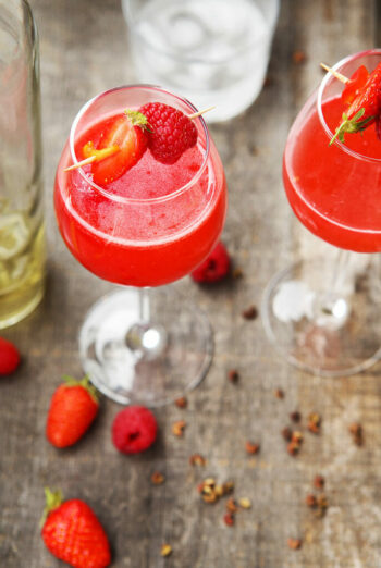 1/ Prepare the cocktail mix the night before: crush the raspberries, then add strawberry purée, bird’s eye chilli and Sichuan pepper. Add 120ml dessert wine. Leave to infuse for 30 minutes.
