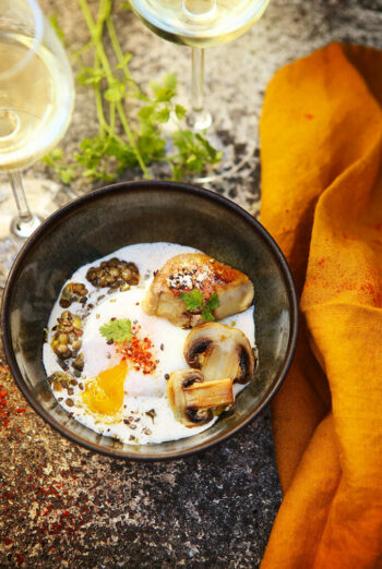« Accord valeur sûre » : un blanc sec structuré d’élevage barrique apportera une légère acidité pour relever l’onctuosité de l’œuf et des notes fumées en accord avec les champignons.
