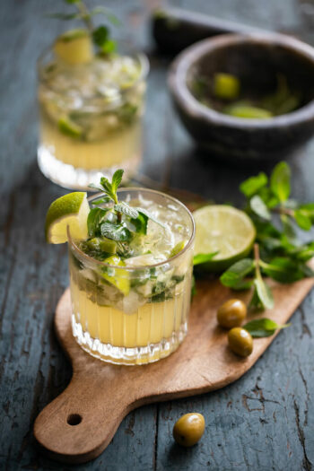 1/ Slice lime into small pieces. Add the mint leaves to the bottom of a mojito glass with lime pieces and 5ml of cane sugar per glass. Crush with a muddler.